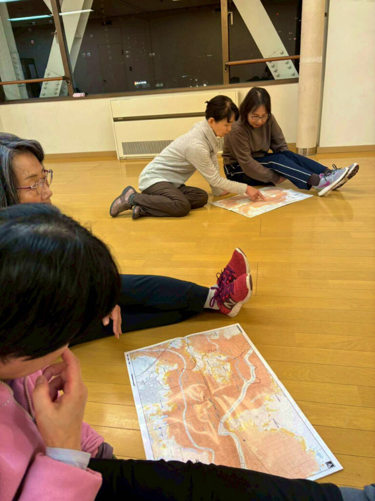 体操を始める前に、防災士でもある長谷川さんの防災講座があり、防災マップを見ながら、53区が置かれている災害リスクや、避難行動についてのお話しがありました。