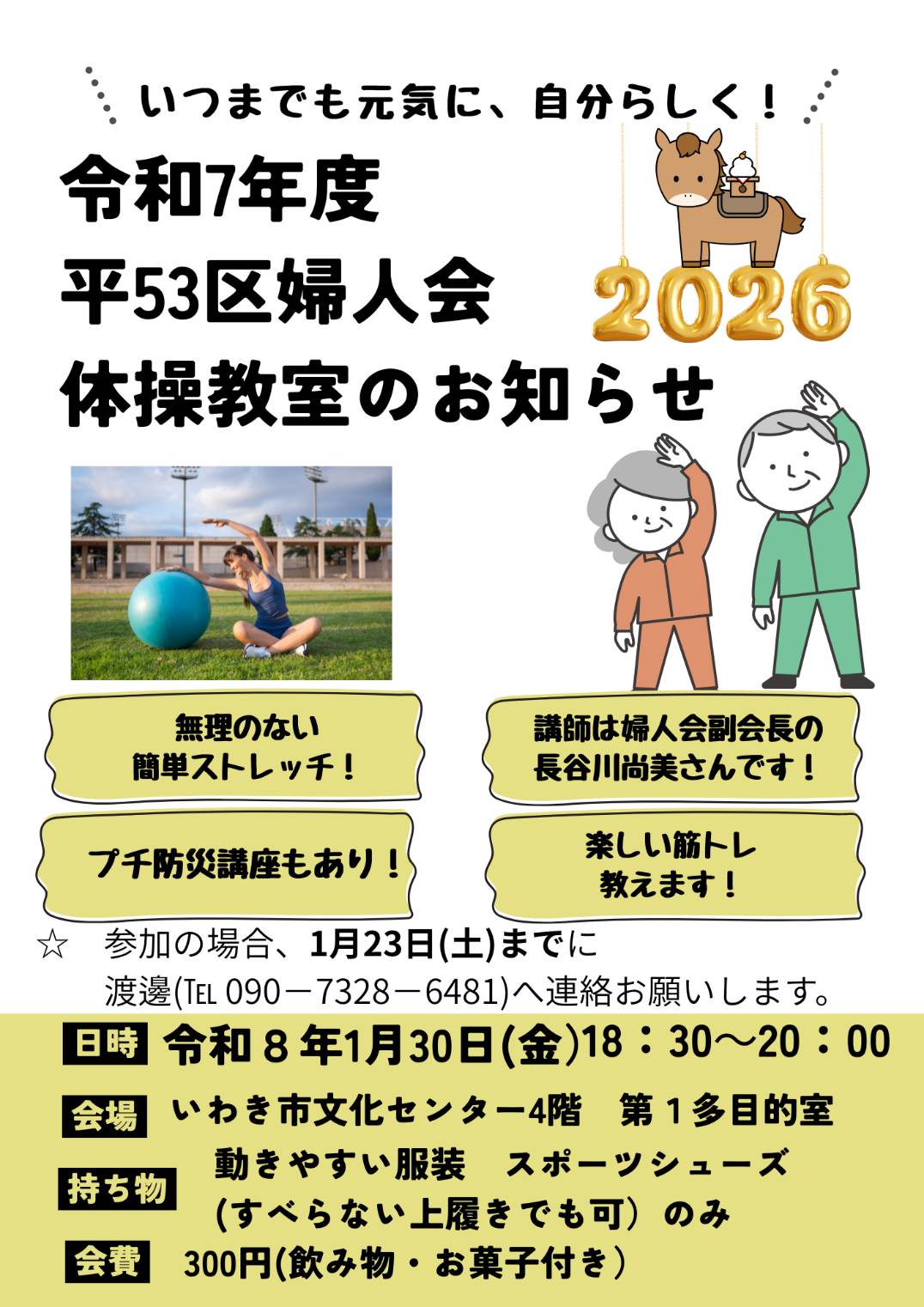 平53区婦人会体操教室が、1月30日(金)午後6時30分から、文化センター多目的室で開催されました。今回は婦人会の長谷川尚美副会長が講師となり、「無理のない簡単ストレッチ」を教えてもらいました。