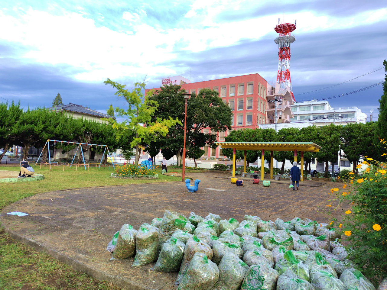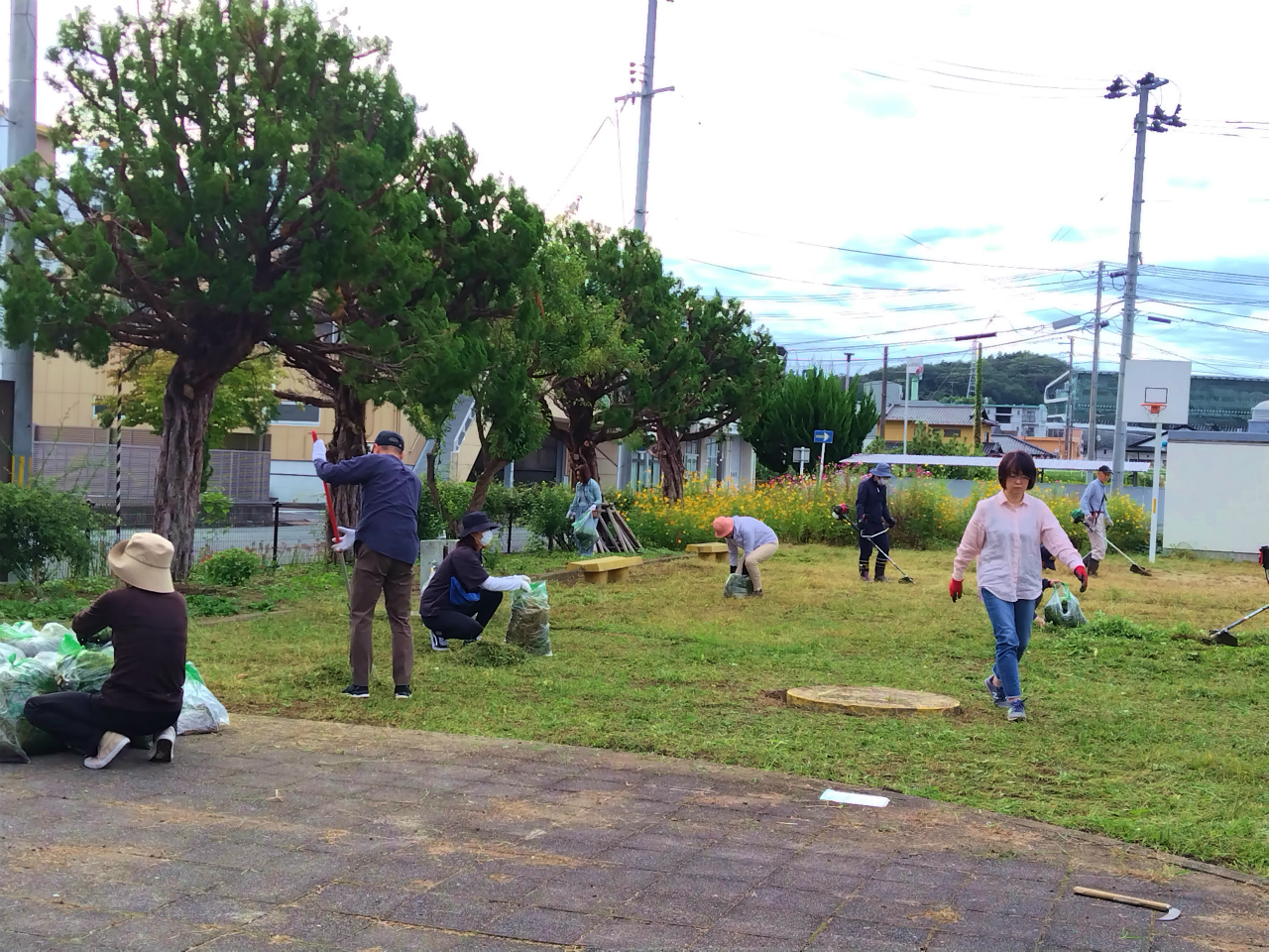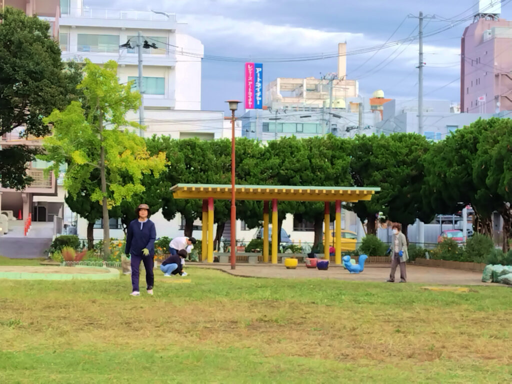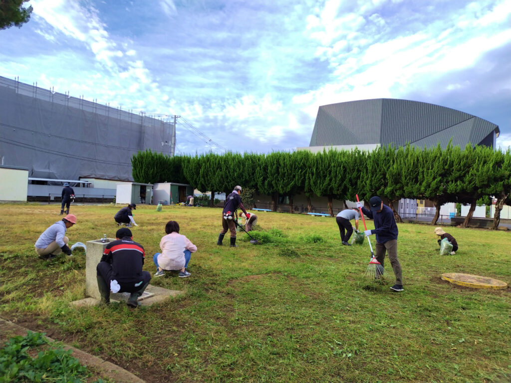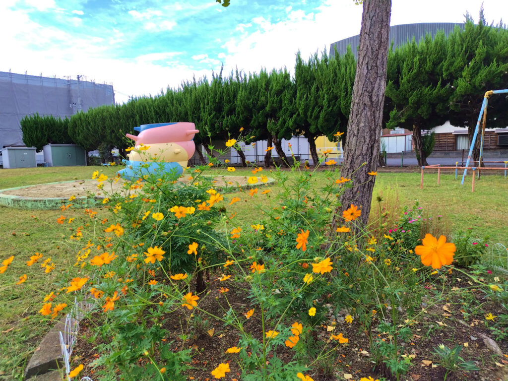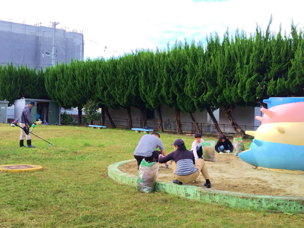 花壇内には手入れされたキバナコスモスの花などが咲いていましたが、公園全体には雑草が生い茂った状態になってましたので、皆さんに協力していただき草刈り作業を中心に2時間ほど行いました。