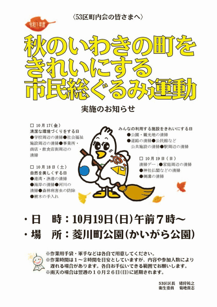 恒例の市主催、「秋のいわきのまちをきれいにする市民総ぐるみ運動」が10月19日(日)に実施され、53区町内会では菱川町公園内の清掃を朝7時から行いました。
